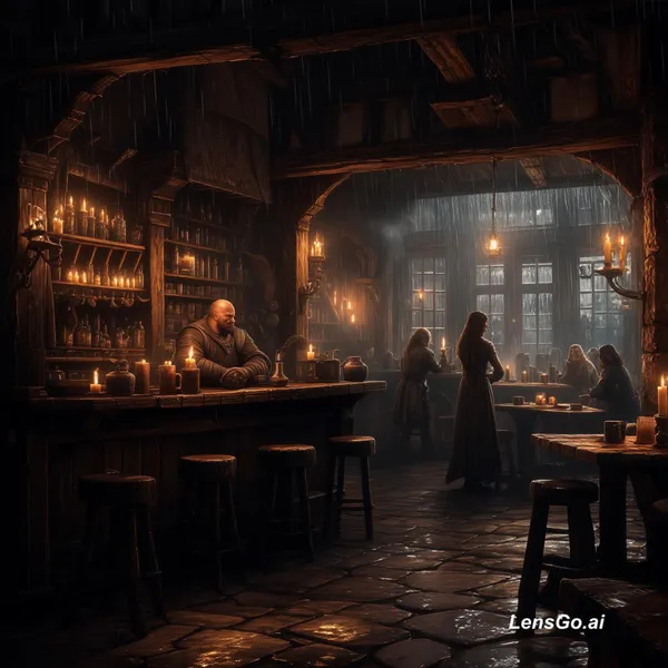AI Image: Dark fantasy medieval tavern interior, cinematic lighting, warm candlelight, smoky atmosphere, rain