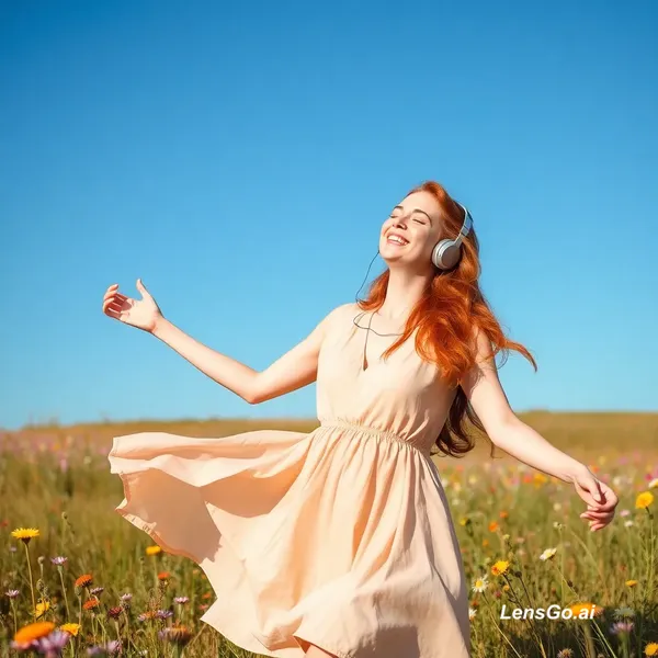 A joyful red-haired woman dancing freely in a flower-filled meadow under a clear blue sky, wearing flowing light dress and wireless headphones, her eyes closed, smiling, hair and fabric moving in the wind, dreamy natural light, soft focus, ethereal mood, wildflowers all around, sense of freedom and presence