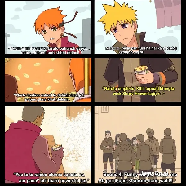 Scene 01Narration: “Ek din achanak Naruto India pahunch gaya… aur usne kuch aisa dekha jo usne kabhi nahi dekha!” Scene 2 Naruto street food dekh raha hai. Narration: “Yahan log ramen nahi… pani puri khate hain!” Scene 3 Naruto pani puri khata hai aur shock ho jata hai. Naruto: “Ye to ramen se bhi zyada powerful hai!” Scene 4 (Funny End) Naruto shadow clones banata hai aur sab pani puri khane lagte hain. Narration: “Ab India me pani puri ka stock khatam hone wala hai!”