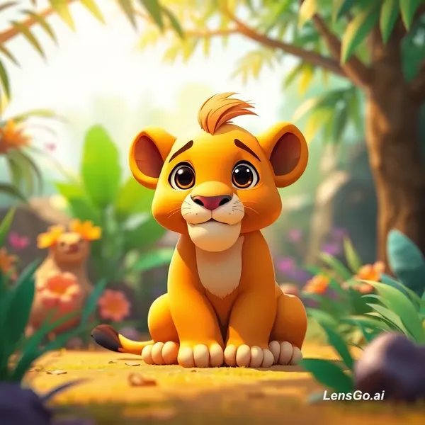 AI Image: 3D cartoon style cute baby lion sitting in colorful jungle, soft sunlight, big expressive eyes, chil
