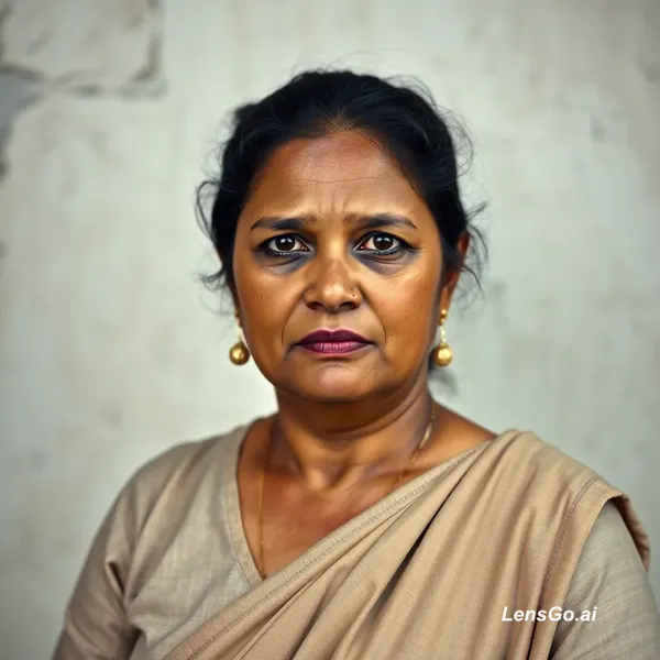 Photorealistic square-cropped portrait zoomed out slightly to show more neutral slightly textured background like soft muted concrete wall or linen fabric weave for added dimension, featuring a 27-year-old slightly overweight Indian woman, no makeup, natural imperfect skin texture with visible pores and fine details preserved, wearing traditional native Indian attire such as simple muted-tone salwar kameez or kurta with dupatta, gold earrings and necklace (no nose ring), subdued composed expression with quiet demeanor, direct gaze at camera, shoulders squared, centered framing. Soft diffused natural lighting with gentle shadows, authentic high-end contemporary editorial style, hyper-detailed, 8k resolution -ar 1:1 -style raw