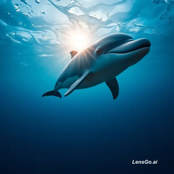 AI Image: Wide 3D underwater shot. Deep blue ocean with sun rays shining through. A dolphin swims quickly, the