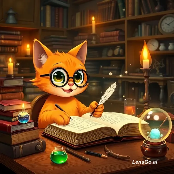 /image prompt: A very cute, expressive, animation-style orange tabby cat (like a Studio Ghibli or Pixar character) with large, sparkling eyes and a curious expression, sitting at a cozy, cluttered wooden desk and studying magic. The cat is wearing tiny round spectacles, holding a feather quill with its paw, and writing glowing runes into a massive, open spellbook. The desk is cluttered with stacked leather-bound magic books (titles like "grimorium alchemiae" and "ancient potions"), bubble-shaped glass vials with colored glowing liquids, a small glowing cauldron, wands, a crystal ball, and whimsical alchemy tools. In the background, cozily cluttered wooden shelves filled with more books, strange artifacts, and magical items. A few candles and an old oil lamp provide warm, soft light, creating a cozy and magical atmosphere. Magic sparkles and a faint light aura emanating from the spellbook. Cinematic lighting, whimsical and cozy atmosphere, high-quality digital art, masterpiece, highly detailed.