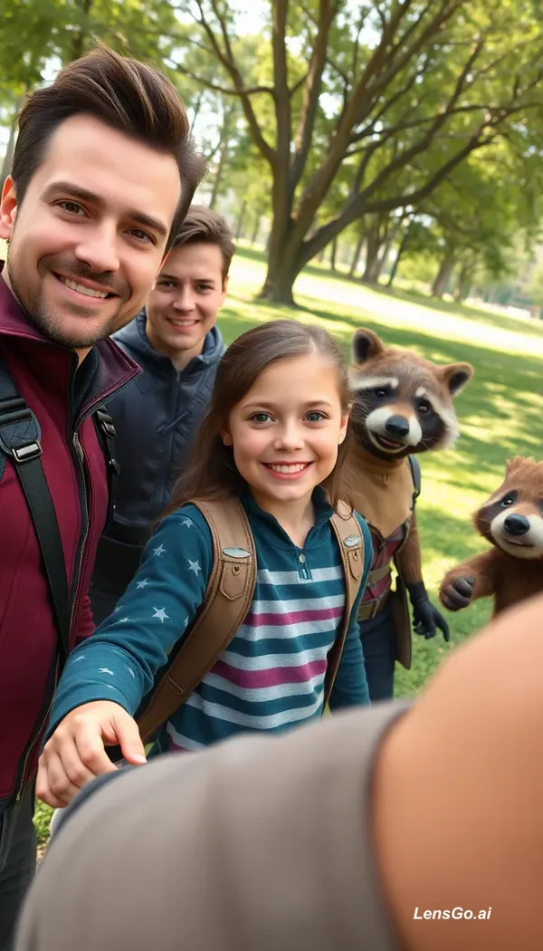 Renderizado 3D CGI estilizado de alta calidad al estilo Pixar, composición Horizontal 3:1. De los siguientes: Chris Pratt: Peter Quill vestido como Star-Lord Zoe Saldaña: como Gamora Dave Bautista: como Drax el Destructor Rocket Raccoon Groot Pom Klementieff: como Mantis Karen Gillan: como Nebula capturados en una caótica y alegre selfie en un parque. Añade la imagen de una niña de 10 años aproximadamente como el sujeto principal de la selfie, conservando su identidad facial exacta, expresión natural y proporciones. sitúala en el centro como punto focal. A su alrededor, sin dejar espacios vacíos, se encuentran los personajes antes mencionados, todos festivos y contentos con gorritos de fiesta de cumpleaños. La niña además sostiene un Smart phone moderno, tomándose la selfie con el grupo. Todos se superponen ligeramente, interactuando y creando una atmósfera festiva, caótica y alegre. Ambiente: un parque ambientado por completo con motivos de fiesta de cumpleaños: globos, confeti, adornos y un letrero entre dos árboles que tiene la leyenda ‘Feliz cumpleaños Elenita’. Sin marcas de agua.
