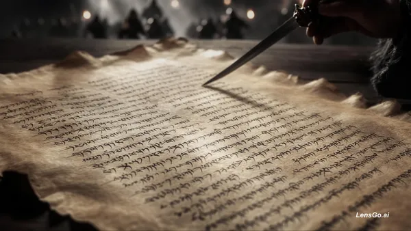 Cinematic close-up of an ancient, weathered parchment. A quill writes in elegant calligraphy. Behind the parchment, shadows of warriors passing by. Dramatic, high-contrast lighting, 8k, historical atmosphere., shot on modular 8K digital cinema camera, standard prime lens, 35mm standard natural perspective, f/1.4 shallow depth of field, creamy bokeh, professional cinematography, ultra-detailed, 8K resolution, film grain, cinematic color grading