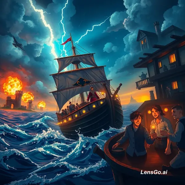 anime style, cinematic pirate adventure montage, a legendary pirate ship crossing a raging storm, thunder and lightning illuminating the crew, transition to exotic islands full of mystery and ruins, fast-paced naval battle with explosions and cannon fire, close-up of determined captain, then warm tavern scene with crew laughing, drinking and celebrating friendship, sunset scene repairing ship together, emotional and adventurous atmosphere, strong friendship bonds, epic anime opening, dynamic camera angles, dramatic lighting, ultra detailed, 4k