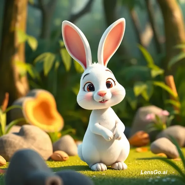 AI Image: cute white rabbit cartoon, pixar style, jungle background, 3D cartoon, ultra HD