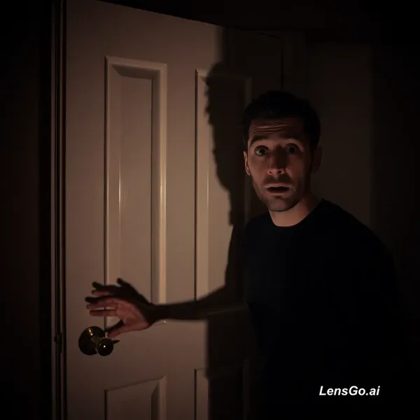 AI Image: man standing close to door, scared expression, hand near handle, dim corridor, shadows stretching be
