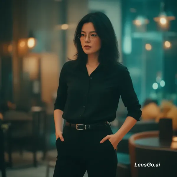 Have the model in Figure 1 wear the black shirt top and black trousers with belt in Figure 2, and make different poses in different scenes. The scenes should match the clothing and create a natural, lifelike atmosphere.Please note that the output image should be a single person in a single scene.
