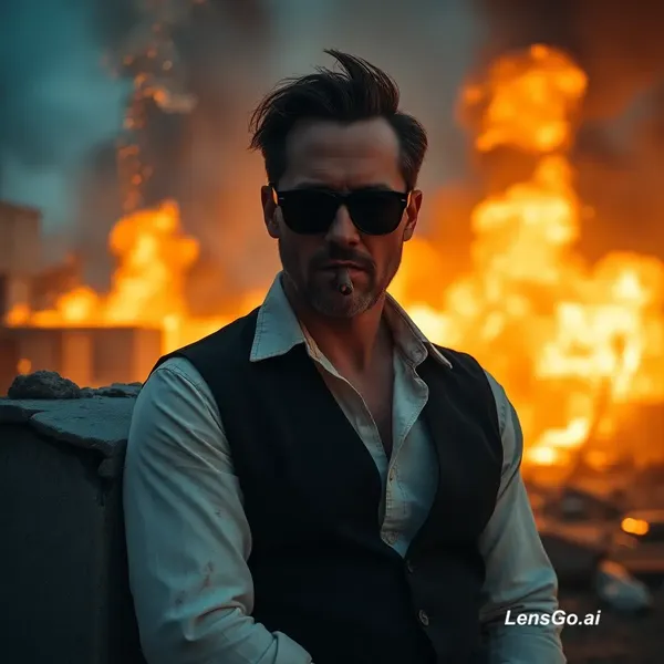 A cinematic slow-motion video of a serious man wearing a black vest, white dirty shirt and sunglasses, leaning against a broken concrete pillar in a burning city. He is smoking a cigar calmly while fire and explosions burn in the background. Sparks and embers floating in the air. Dramatic orange and blue lighting, intense atmosphere. The camera slowly pushes in toward his face, slight wind moving his hair and shirt. Fire flickering behind him, smoke moving naturally. Ultra-realistic, 4K, shallow