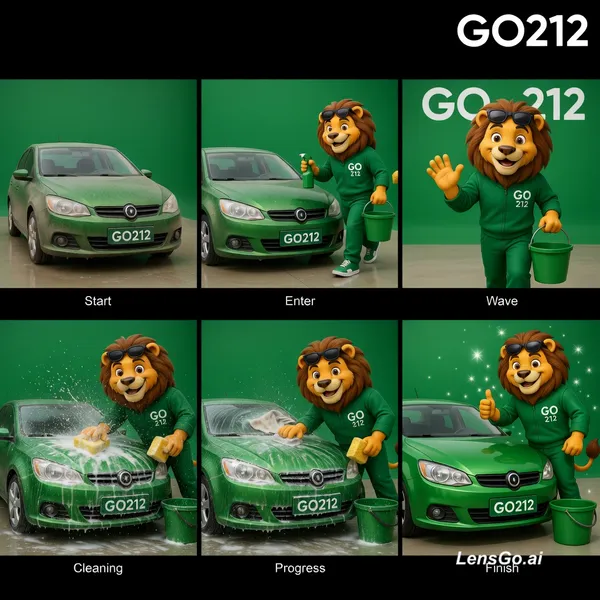 Use the provided image only as a style and character reference. Create a full animated sequence from start to finish. Follow EXACTLY this story: 1. Start with a slightly dusty green car (light dust, not too dirty). 2. The lion is not visible at the beginning. 3. The lion enters the scene from the side holding cleaning products (bucket, sponge, spray). 4. The lion stops in front of the car and gives a short friendly wave (hello). 5. Then the lion starts cleaning the car using a sponge and cleaning tools. 6. Show foam, bubbles and light water splashes during the cleaning. 7. The car must progressively become cleaner step by step during the process. 8. At the end, the car becomes fully clean, shiny and polished with sparkle effects. 9. The lion stands next to the clean car, smiles and gives a thumbs up. Important rules: - Do not keep the image static - Fully animate the scene - Follow the sequence step by step - No random or chaotic movements - Movements must be smooth, natural and controlled (cartoon human-like animation) - Keep the same character style - Use a clean green background (GO212 style) - Duration: 6 to 8 seconds - Cinematic and professional look