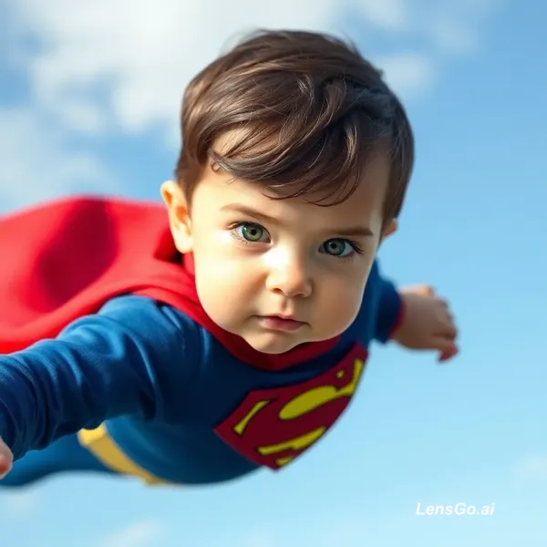 I need you to provide me a color image of a baby boy with dark brown hair and green eyes, flying through the sky in a Superman costume, from a side view for all of us looking at it, but also his face is turned toward us so that we can see it.