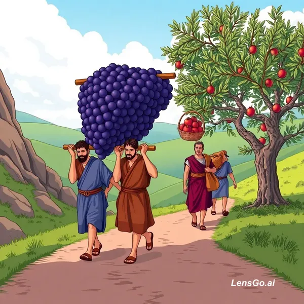 please create an illustration that depicts a scene from an ancient narrative, showing a group of four men walking through a lush, hilly landscape. The style is reminiscent of classic storybook illustrations, with bold lines and a rich color palette. Central Scene The Spies and the Grapes: Two men in the foreground are carrying a massive, oversized cluster of purple grapes suspended from a thick wooden pole balanced on their shoulders. Attire: The men are dressed in traditional ancient tunics (blue, brown, and red) cinched with belts, and they wear simple leather sandals. Supporting Figures: Two other men follow behind them. One carries a large basket with pomegranates, on his shoulder, and a fourth man is visible in the background carrying a sack. Setting and Atmosphere Landscape: The men are walking along a dirt path. To the left is a rocky, shaded hillside, while the right side features a prominent, gnarled olive tree. Background: Rolling green hills sit under a bright blue sky with soft, white clouds. Lighting: The scene is brightly lit, suggesting a clear day, with visible highlights on the men's clothing and the texture of the leaves. Key Details Symbolism: The exaggerated size of the grape cluster is a central focus, emphasizing the fertility and abundance of the land they are traversing. Composition: The figures are positioned in a diagonal line, creating a sense of forward movement and journey.