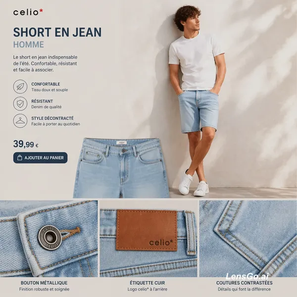 Génère une mise en page e-commerce sous forme de longue image verticale pour un short en jean bleu clair celio* pour homme. Photo portée : Un mannequin homme au style décontracté portant le short, associé à un t-shirt blanc, dans un studio lumineux ou un décor urbain moderne. Détails du produit : Des gros plans (macro) montrant le bouton métallique, l'étiquette en cuir marron à l'arrière avec le logo, et les coutures contrastées. Mise en page : Fusionne ces éléments en une seule image longue et cohérente. Fond neutre beige ou gris clair, éclairage professionnel, haute résolution 8k.
