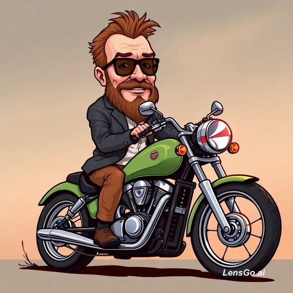 AI Image: Make a caricature image. Make him a big boss and also add a bike, hella saturnus company and hoshin