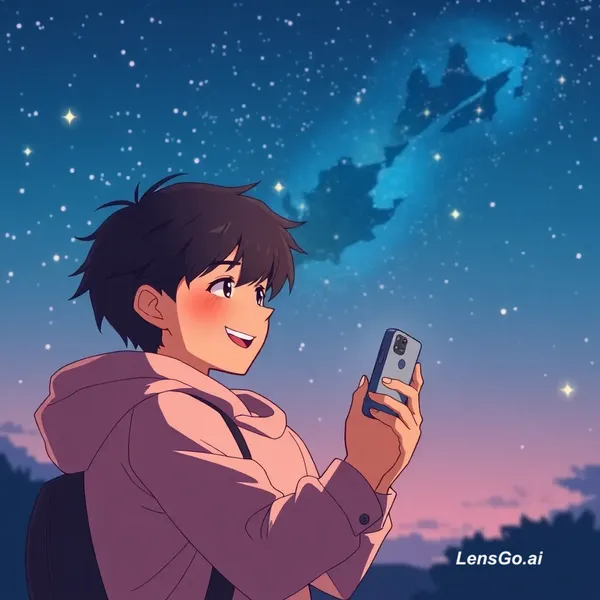 AI Image: anime style, romantic scene, night sky with stars, boy holding phone and smiling, long distance rela