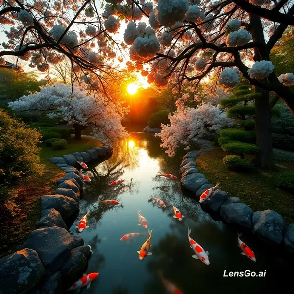 AI Image: A serene Japanese garden at golden hour, koi pond reflecting cherry blossoms