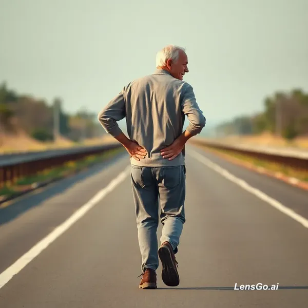 AI Image: A short cinematic advertisement. An elderly man walking slowly on a long road, holding his lower bac