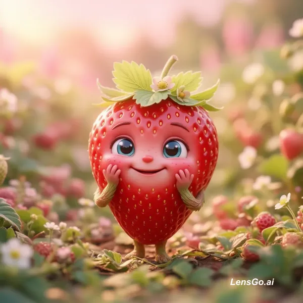 A bright red strawberry with tiny seed details, big sparkling eyes, soft curved eyebrows, and a charming smile. It has delicate leafy hair on top and expressive arms holding its cheeks. The scene is a dreamy berry field with soft pink lighting. 🎬 Hindi Script: मैं जितना खूबसूरत दिखता हूँ, उतना ही हेल्दी भी हूँ। स्किन से लेकर दिल तक, सबका ख्याल रखता हूँ। मीठा हूँ, पर असर गहरा छोड़ता हूँ।