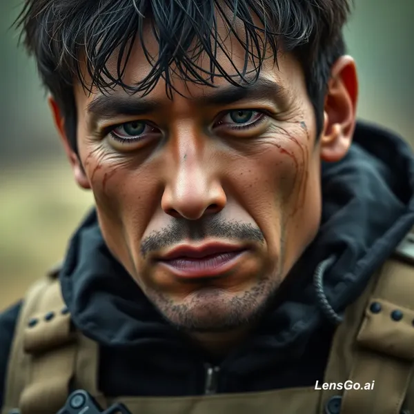 Shot on Arri Alexa, sharp focus, 8k, photorealistic masterpiece: A gritty, close-up portrait image capturing the face of [https://photos.fife.usercontent.google.com/pw/AP1GczOToaFyIbE1K4sUx3JNNQetWlO7dd8eo68H5e_Yx9KmXTKhyXRWQ9js=w693-h923-s-no-gm?authuser=0] as a tired but determined soldier. The character looks identical to the person in the reference image, with the same short, messy dark hair and facial structure. The expression is one of intense focus and resilience amidst chaos. There are streaks of dirt, sweat, and gunpowder residue on the skin. They are wearing professional, modern military combat gear: a dark navy blue tactical jacket (similar to the jacket in image_0.png) under a bulky olive-drab ballistic vest with multiple mag pouches and a small, subdued "NEURAL AI" logo patch on the shoulder. They are holding a modern assault rifle, gripping it tightly. Background is a blurred but recognizable scene of urban combat aftermath: a ruined concrete building with smoke rising in the distance, distant figures of other soldiers, and debris scattered on the ground. Overcast, cinematic lighting, dramatic shadows, and soft background bokeh. Gritty film grain, emotional and raw.