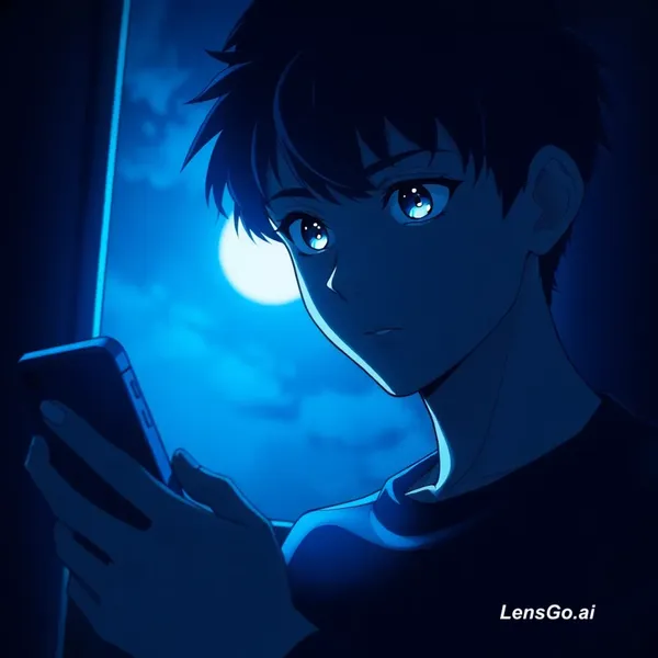 AI Image: Close-up anime boy holding phone in dark room, moonlight entering through window, glowing moon refle