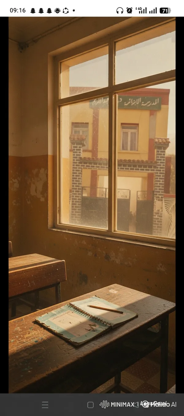 An old classroom in Algeria, nostalgic atmosphere, faded colors, a school notebook on a wooden desk, warm sunlight coming through the window, cinematic style