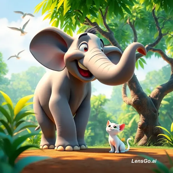 Scene 1 – Jungle Introduction Prompt: “3D cartoon jungle scene, bright green forest, birds flying, a huge friendly elephant standing proudly, a small cute white cat sitting near a tree, colorful environment, Pixar style, cinematic lighting, high detail, animated movie look” 🎬 Scene 2 – Elephant Laughing Prompt: “3D cartoon elephant laughing proudly at a small cat, elephant looking confident and slightly arrogant, small cat calm and silent, forest background, soft sunlight, expressive faces, Pix