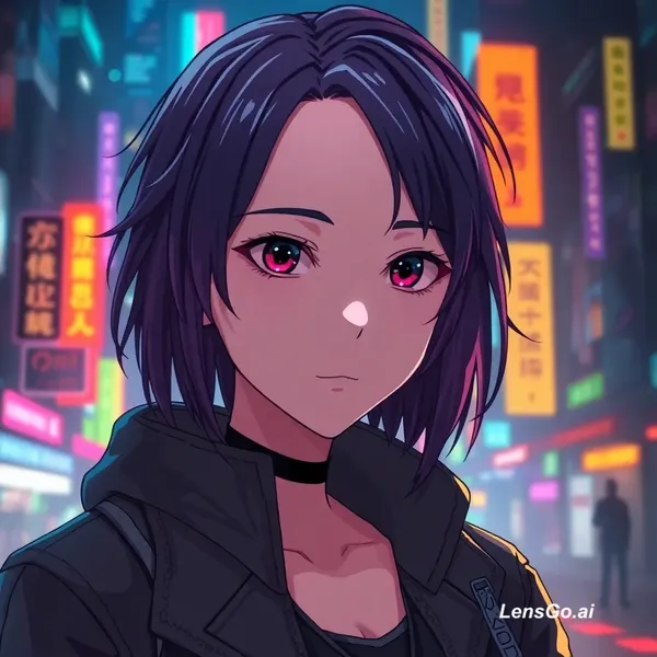 AI Image: "Transform this anime character into a futuristic cyberpunk style, glowing neon city background, cin