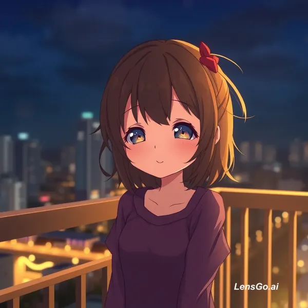 AI Image: Cute anime girl smiling softly, standing on a balcony at night, city lights glowing in the backgroun