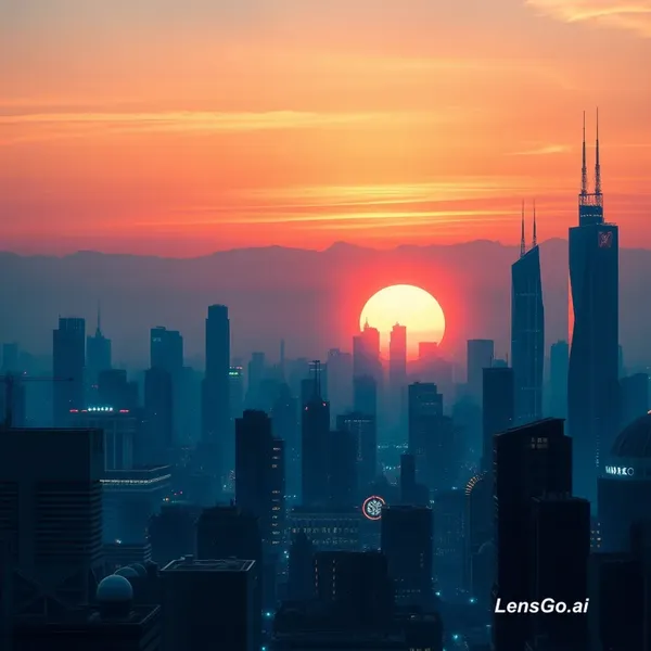 AI Image: Art deco poster of a futuristic city skyline at sunset