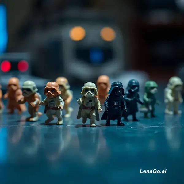 AI Image: Miniature Star Wars inspired creatures walking across a tabletop, tiny detailed figurines with soft