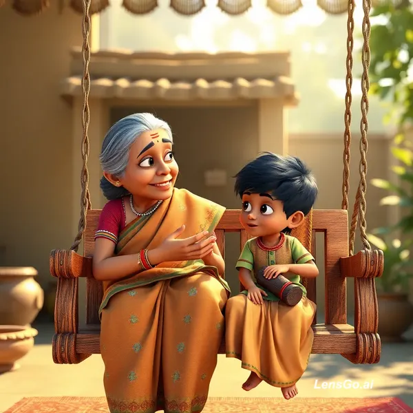 AI Image: "An emotional 3D animation of an Indian grandmother sitting on a wooden swing (jhoola) with her litt