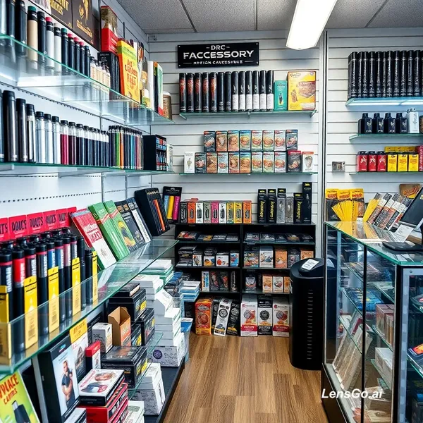 Create high-quality, realistic photos showcasing DRC Accessory LLC, a retail store in Michigan. Include: Clean, organized shelves with vape devices, rolling papers, and smoking accessories. Close-ups of popular products to highlight quality. A wide-angle shot of the store interior showing layout and organization. Storefront photo with clear branding/logo visible. Bright, professional lighting, realistic colors, and inviting atmosphere. The photos should make customers feel confident, show product variety, and give a peek inside the store without showing anyone smoking or vaping. Include optional banners or subtle signs like ‘21+ Only’ and ‘Quality Products’.”