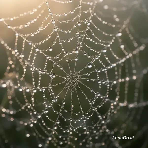 AI Image: Macro photograph of morning dew on spider web, bokeh background