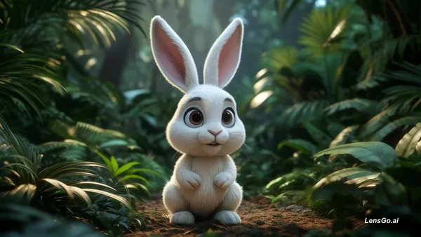AI Image: cute white rabbit cartoon, pixar style, jungle background, 3D cartoon, ultra HD, shot on modular 8K