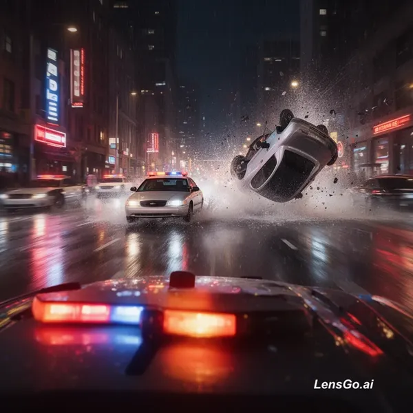 A cinematic, high-speed car chase at night on a wet city street during a rainstorm. The camera is mounted on the front hood of a police car, capturing the flashing red and orange emergency lights in the foreground. A silver sedan is seen speeding away through traffic, splashing through puddles. The police car accelerates, weaving through the wet streets to catch up. The chase reaches a climax when the silver sedan loses control, clips another vehicle, and flips over spectacularly in mid-air, spinning toward the camera amidst a spray of water and debris. The lighting is dramatic, with city neon and streetlights reflecting off the wet pavement.