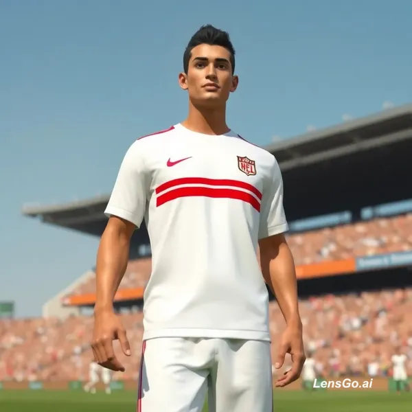 AI Image: Change the character's white uniform to a modern Egyptian white football jersey with two red horizon