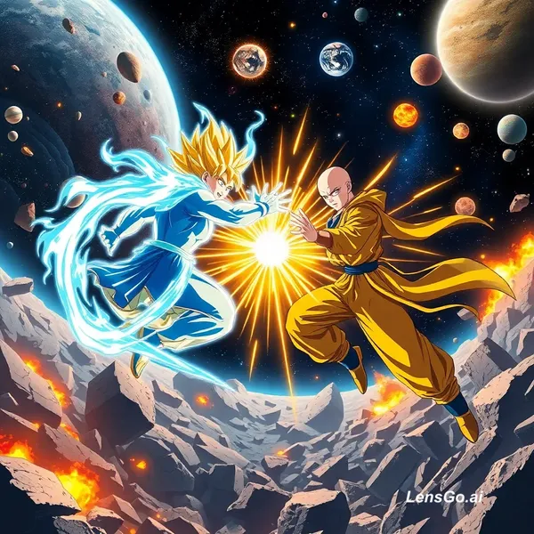 AI Image: An epic anime battle between Son Goku (Infinity form) and Saitama in deep space. The fight begins in