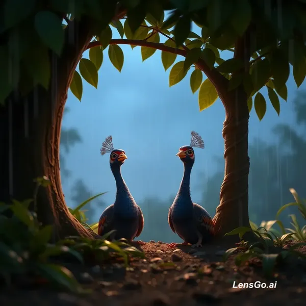 slow cinematic camera zoom toward two small baby peacocks sitting under a bush in the jungle, they look sad and slightly moving as if crying, light rain falling, leaves gently moving in wind, dark cloudy sky, emotional atmosphere, soft cinematic lighting, stable camera movement, 3D pixar style animation”