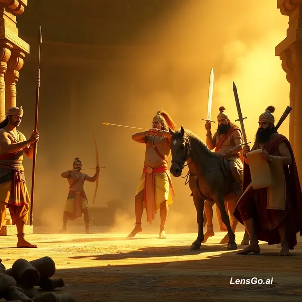 AI Image: Five Pandavas training together in a royal gurukul मैदान, Yudhishthira holding spear calmly, Bhima p