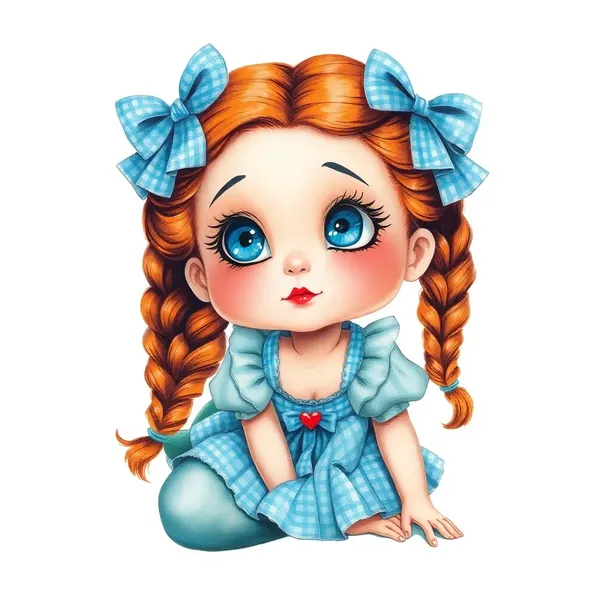 full body image inside margins acrylic ink charcoal pencil airbrushed, Mary Engelbreit style, semi realism, exaggerated caricature, whimsical little girl mermaid, heart shaped face with dimples, big almond shaped bright blue eyes, eyes looking up, pondering, embossed resin auburn braids with blue gingham bows, wearing a Dorothy from Oz costume, sitting with tail curved up behind her, on white background