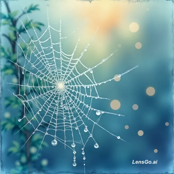 AI Image: Macro photograph of morning dew on spider web, bokeh background
