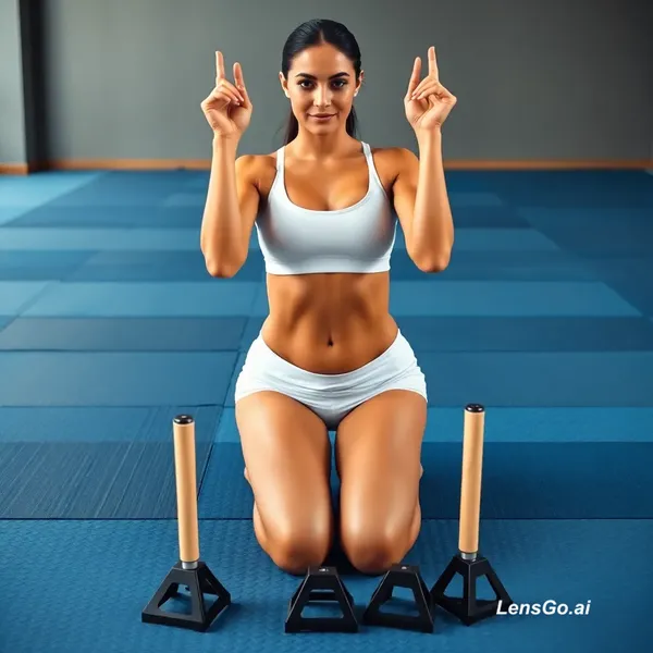 Frontal, slightly low-angle portrait orientation view of an indoor gym scene showing a kneeling woman centered in the mid-ground on interlocking blue foam floor mats; camera perspective is roughly chest-to-knee height giving a slight upward angle. She is kneeling on both knees with lower legs tucked beneath her, torso upright and chest thrust slightly forward, shoulders back and a very mild forward lean; both hands are held just above two wooden-handle parallettes with relaxed, slightly curved fingers, palms oriented downward. She wears a white, close-fitting sports bra without any shoulder straps and matching white low-waisted athletic shorts; the fabric is smooth, matte and stretched snugly across the body, showing clear contours of muscle and skin. Skin appears smooth and glossy with visible sheen from sweat, producing specular highlights on the shoulders, chest, upper arms and thighs; Three short wooden-handled parallettes with pale cylindrical wooden grips mounted on dark, geometric metal bases (triangular cutout shapes) are arranged in the foreground and mid-ground; the nearest parallettes sit on the blue mat with soft, diffuse shadows beneath them. The blue puzzle mats show interlocking edges and small torn triangular pieces along a seam in the foreground; mat texture is slightly pebbled and matte. Background is a gym interior: a vertical black padded column slightly left of center, mirrored wall panels on the far left reflecting gym graphics, and a yellow-and-black pa