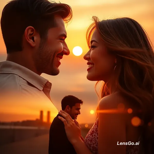 } Animate this romantic couple collage into a cinematic love reel. Add: - smooth camera movement - slow zooms - blinking eyes - natural smiling - hair movement in the wind - warm sunset lighting flicker - romantic atmosphere - realistic motion - soft cinematic transitions - city lights bokeh animation Style: ultra realistic, emotional, cinematic, Instagram reel, 9:16