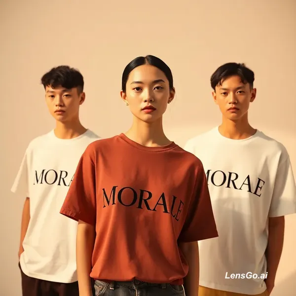 An advert for a luxury perfume brand, minimalist fashion editorial photoshoot, 2 models wearing t-shirt with bold "M O R A L E" typography, Use Image of font attached clean style, one Asiatic female with boring face in the middle of the studio, pastel toned background with smooth gradient, soft shadows and high-end studio lighting, inspired by Balenciaga + Fear of God campaigns, fashion editorial look book aesthetic, ultra sharp focus, Canon EF 50mm F/1.4, 8k, shot for Vogue magazine, contemporary streetwear campaign.