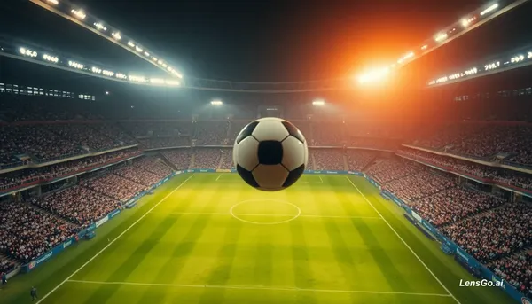 AI Image: High-speed sports photography realism inside a packed stadium. A soccer ball spins alone in midair w