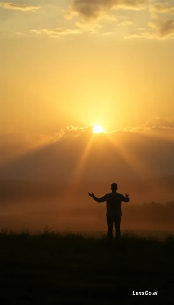 A cinematic sunrise over a quiet landscape with soft golden light breaking through clouds. A peaceful countryside with a faint silhouette of a person standing in stillness, arms slightly open in prayer. Gentle fog resting over fields, warm divine light rays descending from the sky, ultra-realistic, 4K, shallow depth of field, spiritual, emotional atmosphere.