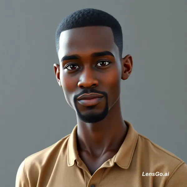 Use this photo to Generate a young Igbo man, age 27, light brown skin, athletic build, short black hair, neatly trimmed beard, calm gentle eyes, simple trader clothing (fitted shirt, trousers, sandals), sometimes traditional isiagu attire, humble but strong presence, expressive emotional face, Pixar-style 3D, ultra detailed
