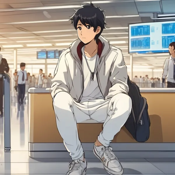AI Image: Medium shot inside airport terminal, anime cinematic style. Boy wearing white pants, white t-shirt,