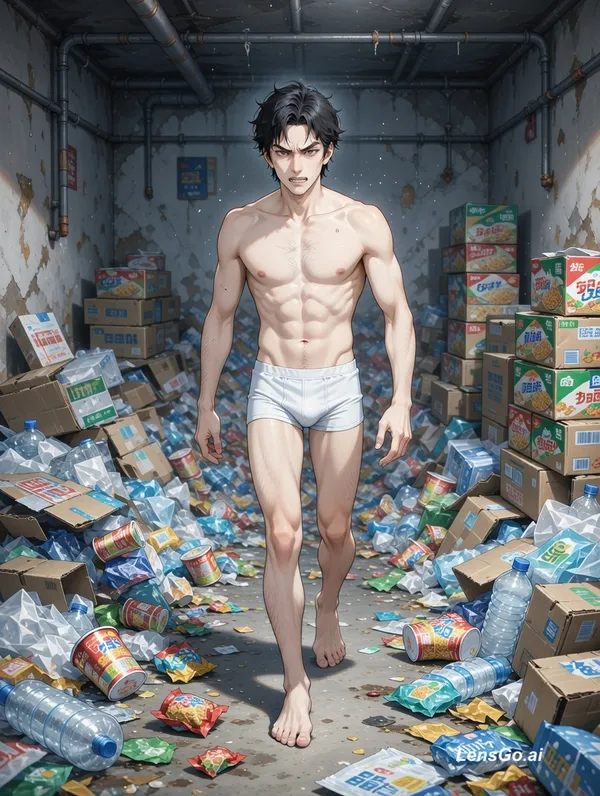 manhua, theo phong cách ảnh 1, 1 người đàn ông, mặc áo lót đơn giản, ánh mắt hung ác, tóc ngắn, 40 tuổi, đang đi lại trong phòng tầng hầm, không gian xung quanh là rác, thùng mỳ tôm, vỏ thùng nước